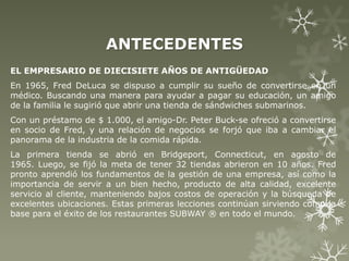 Este documento proporciona información sobre la historia, misión, visión, cultura organizacional y programa de responsabilidad social de Subway. Resume que Fred DeLuca fundó la primera tienda Subway en 1965 y desde entonces la compañía se ha convertido en una de las cadenas de comida rápida más grandes del mundo gracias a su enfoque en ofrecer opciones saludables y un compromiso con la comunidad y el medio ambiente.