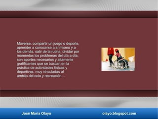 El documento describe cuatro tipos de prácticas deportivas adaptadas e inclusivas: práctica normalizada, práctica específica, práctica mixta y práctica inclusiva. También propone criterios para la adaptación de juegos y deportes para personas con discapacidad y ofrece ejemplos de deportes específicos diseñados para promover la inclusión, como boccia, goalball y baloncesto en silla de ruedas.