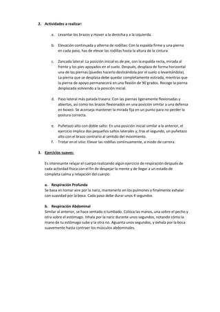 Este documento describe un calentamiento y rutina de ejercicios que incluye movimientos para la cabeza, hombros, caderas, brazos y piernas, seguido de actividades como levantar los brazos, elevar las rodillas y saltar lateralmente. Finalmente, recomienda ejercicios de respiración profunda y abdominal para relajar el cuerpo después del entrenamiento.