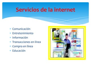 El internet brinda diversos servicios como la comunicación, el entretenimiento, información, transacciones y compras en línea, y educación a través de servicios de internet.
