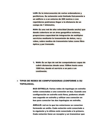 Este documento describe los diferentes tipos de redes de computadoras, incluyendo las redes de área personal (PAN), de área de campus (CAN), de área local (LAN), metropolitana (MAN) y amplia área (WAN). También describe las diferentes topologías de red como bus, estrella, anillo, malla y árbol. Explica qué tipo de redes se utilizan para comunicaciones a larga, mediana y corta distancia.