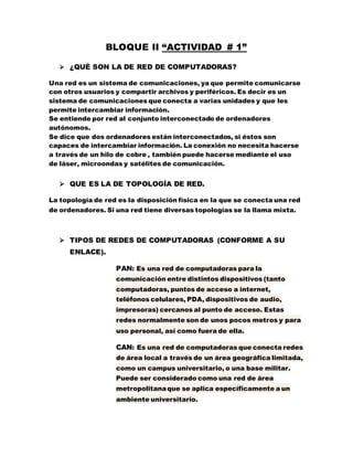 Este documento describe los diferentes tipos de redes de computadoras, incluyendo las redes de área personal (PAN), de área de campus (CAN), de área local (LAN), metropolitana (MAN) y amplia área (WAN). También describe las diferentes topologías de red como bus, estrella, anillo, malla y árbol. Explica qué tipo de redes se utilizan para comunicaciones a larga, mediana y corta distancia.