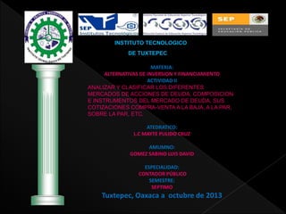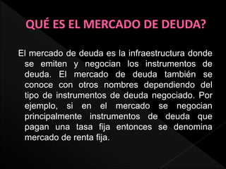 El documento describe los diferentes mercados de deuda, incluyendo instrumentos como CETES, Bondes, UDIBONOS y PIC-FARAC. Explica que los gobiernos y empresas pueden obtener financiamiento a través de préstamos o emitiendo instrumentos de deuda en el mercado. Además, detalla características clave de los instrumentos de deuda como su cotización, colocación, tasa de interés y riesgo del emisor.