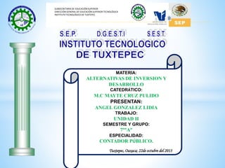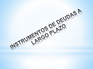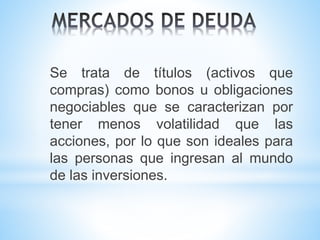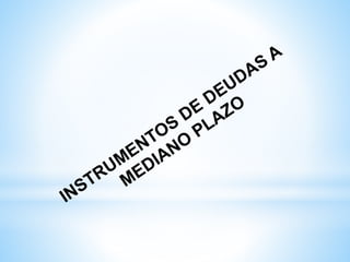 El documento describe diferentes instrumentos de deuda o inversiones de renta fija que pueden ser usados para inversiones a corto, mediano y largo plazo. Estos incluyen certificados de la tesorería, bonos de desarrollo del gobierno, pagarés bancarios, comerciales corporativos y otros instrumentos emitidos por entidades públicas y privadas. El documento explica las características clave de cada instrumento como su valor nominal, plazo, rendimiento y garantías.