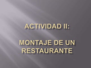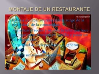 El documento propone crear un restaurante para satisfacer la necesidad de la comunidad de un lugar para reunirse en familia. El objetivo principal es generar independencia y empleo a través de un servicio excelente, mientras se generan ingresos familiares y autosuficiencia económica. El emprendedor está capacitado para aplicar su formación y conocimiento al negocio y tomará capacitación en atención al cliente para asegurar la satisfacción y lealtad de los clientes.