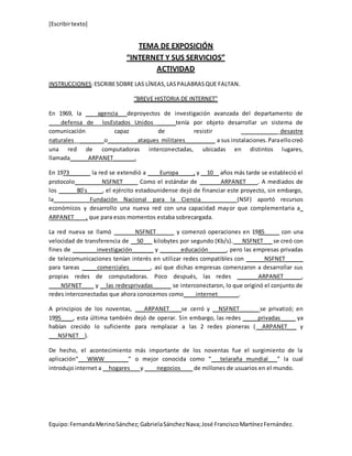 El documento resume brevemente la historia de Internet. Explica que en 1969 la Agencia de Proyectos de Investigación Avanzada del Departamento de Defensa de EE.UU. creó la red ARPANET para que las comunicaciones pudieran resistir desastres naturales o ataques. En los años siguientes se expandió a Europa y se estableció el protocolo NSFNET. A mediados de los 80, la NSF financió la red NSFNET más grande. Poco después, ARPANET, NSFNET y las redes privadas se interconectaron para formar Internet.