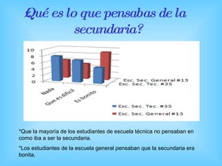 Los estudiantes de primer año describen sus impresiones iniciales de la secundaria en comparación con la realidad que enfrentan. Aunque extrañan tener más tiempo libre, disfrutan de hacer nuevos amigos. Sin embargo, no les gusta la gran cantidad de tarea que les dejan los maestros ni la estricta disciplina de algunos profesores.
