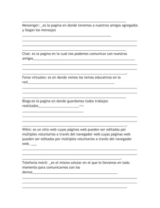 Las TIC incluyen tecnologías como el correo electrónico, las páginas web, el messenger y el chat que permiten la comunicación y el intercambio de información. Estas tecnologías han llevado a la globalización al ampliar nuestras capacidades mentales y facilitar nuestra interacción social, aunque también plantean riesgos como el acoso cibernético y la adicción a Internet. Las siglas ERP, CRM, CAD y CAM se refieren a sistemas empresariales de planificación de recursos, gestión de clientes,