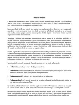 Este documento describe la evolución de la familia a través de la historia y diferentes tipos de organización familiar. Comienza con las primeras comunidades primitivas y la horda, luego pasa a describir formas como la familia consanguínea, punalúa, sindiásmica y monogámica. También cubre la familia matriarcal, patriarcal y poligámica. Finalmente, discute los cambios modernos en la familia y las opiniones sobre su importancia para la sociedad. El documento proporciona actividades como responder pregunt