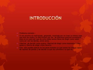 Este documento discute el concepto de libertad y su relación con el problema del bullying. Brevemente describe qué es el bullying y da un ejemplo. Luego explora las definiciones de libertad, los tipos de libertad, y si la libertad solo se aplica a los seres humanos. Finalmente, relaciona cómo el bullying va en contra de la libertad de las víctimas y concluye que respetar la libertad de los demás es importante para abordar el problema del bullying.