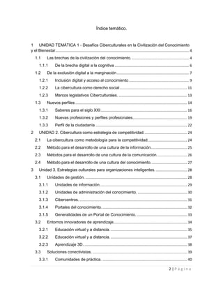 El documento describe los desafíos de la civilización del conocimiento y la cibercultura. Explica las brechas digitales y cognitivas que existen, así como el paso de la exclusión digital a la marginación. También analiza la importancia de la inclusión digital y el acceso al conocimiento para todos los sectores de la sociedad, así como la necesidad de políticas que promuevan el desarrollo de una verdadera cultura digital e inclusiva.