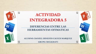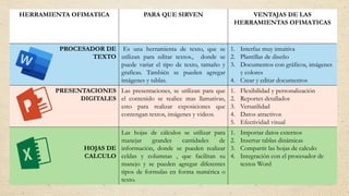 Este documento resume las diferencias entre tres herramientas ofimáticas: procesadores de texto, presentaciones digitales y hojas de cálculo. Los procesadores de texto se usan para editar textos con formato, mientras que las presentaciones digitales se usan para crear exposiciones visuales con texto, imágenes y videos. Las hojas de cálculo se usan para manejar y analizar grandes cantidades de datos numéricos usando fórmulas y tablas dinámicas.