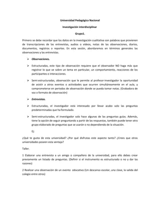 El documento describe diferentes tipos de observaciones y entrevistas cualitativas que se pueden usar en la investigación. Las observaciones pueden ser estructuradas, semi-estructuradas o no estructuradas, mientras que las entrevistas pueden ser estructuradas o semi-estructuradas. El taller propone elaborar una entrevista y realizar una observación para practicar estas técnicas cualitativas.