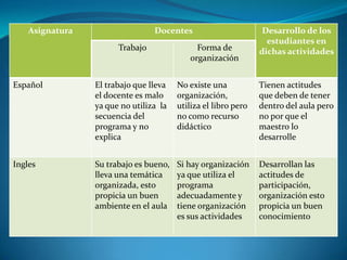 El resumen analiza el trabajo de los docentes y el desarrollo de los estudiantes en diferentes asignaturas. En Español, el trabajo del docente no está bien organizado y no sigue la secuencia del programa, mientras que en Inglés el docente tiene una buena organización y utiliza adecuadamente el programa. En Asignatura Estatal y Matemáticas, los docentes tienen buena organización de actividades y materiales didácticos, lo que contribuye al desarrollo positivo de los estudiantes.