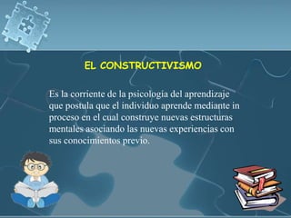 Este documento presenta los principales conceptos del constructivismo como corriente de la psicología del aprendizaje. Explica que el constructivismo postula que el individuo aprende construyendo nuevas estructuras mentales al asociar nuevas experiencias con conocimientos previos. Luego resume los principales representantes del constructivismo como Piaget, Vigotsky y Bruner, y describe los pilares de la teoría genético-desarrollista de Piaget, la teoría socio-histórica de Vigotsky y el constructivismo radical. Finalmente, explic