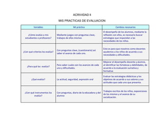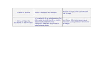 La evaluación debe reconocer los logros y dificultades de los estudiantes para tomar decisiones y mejorar. Se evalúa el desempeño, actitudes y avances de los estudiantes a través de preguntas, trabajos escritos y exposiciones para identificar fortalezas y debilidades con el fin de ayudar a los estudiantes de acuerdo a sus necesidades. La participación de los estudiantes en la autoevaluación y evaluación entre pares es importante para que reconozcan su capacidad y se ayuden mutuamente.