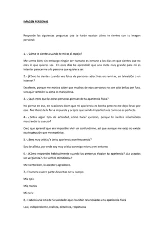 Este documento presenta los resultados de una actividad de autoconocimiento realizada por una persona. En la actividad, la persona identificó tanto conductas positivas como negativas propias. También reflexionó sobre su imagen personal, recibiendo comentarios de otra persona sobre cómo es percibida. Finalmente, realizó un análisis FODA personal para identificar fortalezas, oportunidades, debilidades y amenazas.