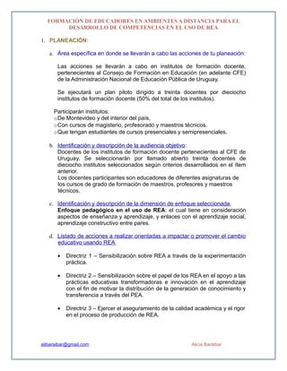 El documento describe un plan piloto para capacitar a 30 docentes de 18 institutos de formación docente en Uruguay en el uso de Recursos Educativos Abiertos (REA) a través de Prácticas Educativas Abiertas. La capacitación consistirá en una jornada presencial inicial sobre REA y una fase en línea donde los docentes producirán REA sobre temas de sus cursos y los publicarán en el Portal Educativo Uruguay Educa, evaluando su calidad. El objetivo es promover el uso de REA para innovar en la enseñanza