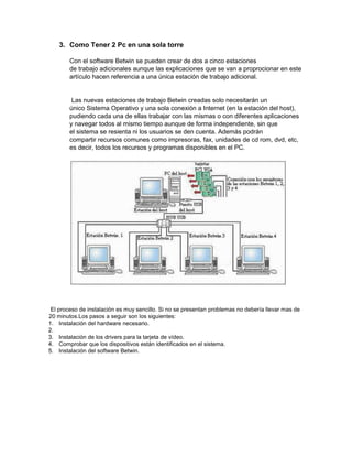 El documento describe las máquinas virtuales, sus tipos y beneficios. Explica que una máquina virtual es un software que emula un ordenador completo dentro de otro, permitiendo ejecutar programas de forma aislada sin afectar al sistema anfitrión. Menciona algunos tipos comunes como VMware Workstation, VirtualPC, Hyper-V y VirtualBox. También cubre cómo usar software como Betwin para crear dos estaciones de trabajo virtuales independientes en una sola torre física compartiendo recursos, y los requisitos mínimos para instalar dicho software.