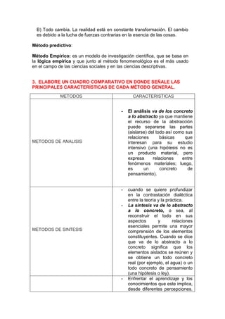 El documento explica la importancia del método en las ciencias de la cultura y describe las características fundamentales del método en estas ciencias. Explica que a través del método se pueden explicar las cosas y dar soluciones a problemas. Luego describe los métodos comprensivo, holístico, dialéctico, predictivo y empírico. Finalmente, elabora un cuadro comparativo de los principales métodos generales y establece semejanzas y diferencias entre ellos.