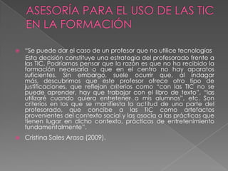 El documento discute la actitud de algunos profesores hacia el uso de las tecnologías de la información y la comunicación (TIC) en la enseñanza. Aunque a veces los profesores aducen falta de capacitación o recursos como razones para no usar las TIC, en realidad suelen tener criterios como que "con las TIC no se puede aprender" o que sólo sirven para entretener. El documento argumenta que los profesores deben estar a la vanguardia de los métodos de enseñanza evolutivos y tecnológicos para acercar a