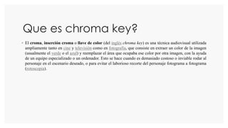 El documento proporciona instrucciones para aplicar efectos especiales de croma o chroma key a un video. Explica que la técnica de chroma key permite reemplazar un color de fondo por otra imagen. Luego, detalla 5 pasos para insertar varios videos con fondos verdes en un video maestro usando el software Pinnacle, aplicar el efecto chroma key para reemplazar los fondos verdes, ajustar la calidad y agregar transiciones entre los videos. El proyecto final se guarda como un archivo Mpeg-4.