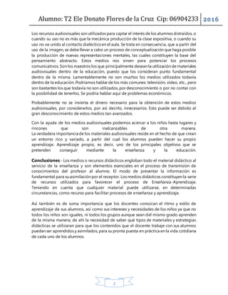 El documento describe el rol importante que cumplen los materiales didácticos en el proceso de enseñanza-aprendizaje. Los materiales didácticos son la principal fuente de información académica y guían el aprendizaje de las asignaturas. Además, permiten que los estudiantes estudien y analicen de forma individual para aclarar dudas. Los materiales audiovisuales también juegan un rol importante al captar el interés de los estudiantes y potenciar los procesos comunicativos. Los materiales didácticos crean un entorno r