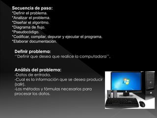 El documento describe los pasos para resolver un problema utilizando la computadora: 1) definir y analizar el problema, 2) diseñar un algoritmo o diagrama de flujo, 3) codificar un programa de acuerdo al algoritmo, 4) compilar y depurar el programa, 5) ejecutar el programa, y 6) elaborar documentación. Explica cada paso en detalle.