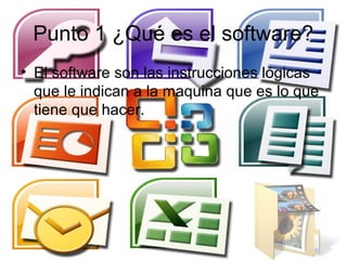 Este documento resume conceptos clave sobre software y sistemas operativos. Explica que el software son instrucciones que le indican a la máquina qué hacer y cómo se clasifica. Define un sistema operativo como un conjunto de programas que administran los recursos de la computadora e interactúan con el usuario. Finalmente, describe características como multitarea, controladores y archivos DLL.