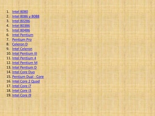El documento describe la historia de los principales microprocesadores de Intel desde el Intel 8080 en 1974 hasta el Intel Core i9 en 2010. Se enumeran 19 microprocesadores de Intel con detalles sobre su producción, velocidad, sockets y otros aspectos técnicos.