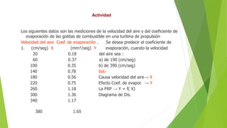 Este documento presenta dos actividades. La primera involucra el uso de regresión lineal para predecir el coeficiente de evaporación de las gotitas de combustible en una turbina basado en la velocidad del aire. Se proporcionan valores de velocidad del aire y coeficiente de evaporación y se usan para predecir el coeficiente cuando la velocidad del aire es de 190 cm/seg y 390 cm/seg. La segunda actividad usa una prueba de chi-cuadrado para determinar si el tamaño del perro está relacionado con el horario para sacar