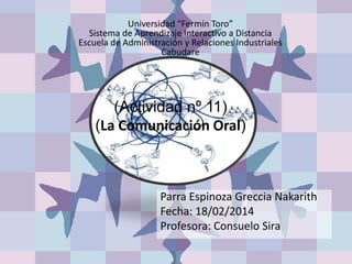 Este documento presenta información sobre la comunicación oral, incluyendo su propósito, elementos como la dicción, fluidez, ritmo, coherencia y claridad. También describe técnicas de comunicación grupal como simposios, debates, mesas redondas y paneles. Finalmente, cubre el uso de ayudas audiovisuales y diferentes tipos de materiales como diapositivas, planos, rotativos, pizarras, cine, radio e internet para apoyar presentaciones orales.