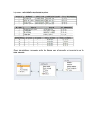 El documento describe una base de datos compuesta por tres tablas (socios, libros y préstamos) y solicita crear las relaciones necesarias entre ellas para el correcto funcionamiento de la base de datos.