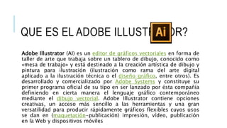 Este documento describe las funciones básicas de Adobe Illustrator, un programa de edición de gráficos vectoriales. Explica que Illustrator se usa para la creación artística digital como ilustraciones y diseño gráfico. Luego, proporciona tres ejemplos breves de cómo usar herramientas básicas de Illustrator como copiar, pegar y editar formas para recrear logotipos de empresas como Microsoft, Toyota y Mitsubishi.