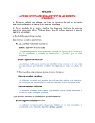 Este documento presenta una actividad sobre los avances importantes en la historia de los sistemas operativos. Se pide elaborar una línea de tiempo con estos avances y clasificar sistemas operativos comerciales como Windows, Linux y Unix. También se explican las clasificaciones de los sistemas operativos por número de usuarios, programas ejecutados simultáneamente, número de procesadores y tiempo de respuesta al usuario. Finalmente, se pide clasificar el sistema operativo asignado según estas categorías y presentar un debate sobre el tema.
