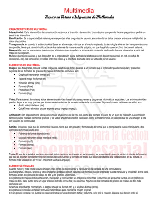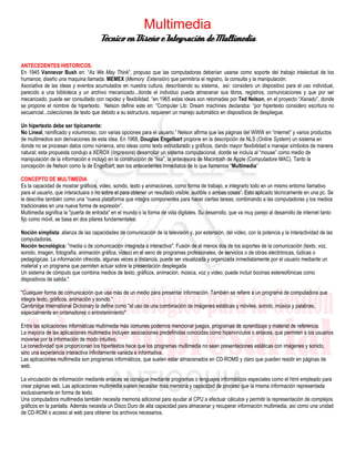 Este documento describe la historia y concepto de multimedia, así como sus características y elementos clave. Brevemente, los antecedentes históricos se remontan a las ideas de Vannevar Bush en 1945 sobre sistemas de almacenamiento y recuperación de información. Estas ideas condujeron al desarrollo del hipertexto y los primeros sistemas multimedia en las décadas de 1960 y 1970. El documento luego define multimedia como la integración de varios medios como texto, gráficos, sonido y video en un solo entorno interactivo. Finalmente, explica