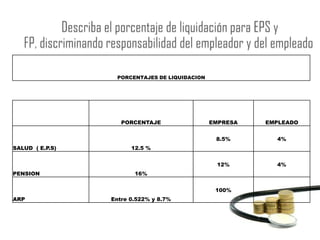 Este documento proporciona porcentajes de liquidación para empresas y empleados para salud (EPS), pensiones y ARP. También define términos clave como EPS, AFP, IPS y ATEP que se refieren a entidades de salud, pensiones, prestadores de salud y accidentes laborales respectivamente.