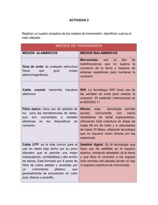 El documento presenta un cuadro sinóptico que compara los principales medios de transmisión alámbricos e inalámbricos. Los medios alámbricos incluyen guías de onda, cable coaxial, fibra óptica y cable UTP. Los medios inalámbricos incluyen microondas, WiFi, WiMax y satelital digital. El documento concluye que la red WAN es la más útil porque proporciona transmisión de datos a larga distancia sobre grandes áreas geográficas.