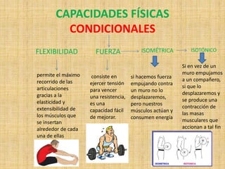 El documento describe las diferentes capacidades físicas condicionales y coordinativas. Entre las capacidades condicionales se encuentran la flexibilidad, fuerza (isométrica e isotónica), resistencia y velocidad. Las capacidades coordinativas incluyen el acoplamiento, orientación, diferenciación, equilibrio, adaptación rítmica y reacción.