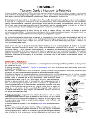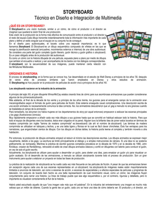 El storyboard es una representación ilustrada de una producción audiovisual mediante viñetas que muestran los encuadres planificados. Se originó en la industria de la animación en los años 1930 como una forma efectiva de comunicar la visión creativa entre el equipo. Hoy en día, los storyboards se usan ampliamente en cine, televisión y publicidad para planificar escenas, ahorrar tiempo y dinero, y garantizar la continuidad visual de una historia.