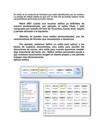 Este documento explica los estilos en Microsoft Word, que son conjuntos de formatos identificados por un nombre. Los estilos permiten aplicar múltiples formatos de texto con un solo clic. Word incluye estilos predefinidos como Título 1, pero también se pueden crear estilos personalizados. Los estilos ayudan a mantener la coherencia y trabajar de forma más eficiente en los documentos.