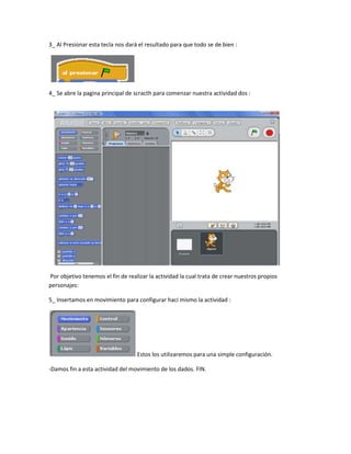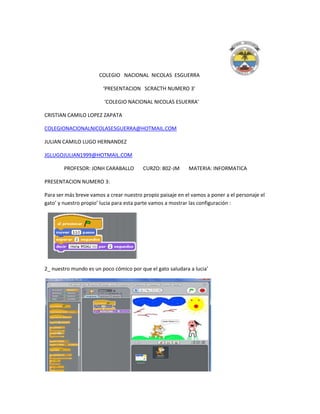 Este resumen describe la Presentación Número 3 de los estudiantes Cristian Camilo López Zapata y Julián Camilo Lugo Hernández para su clase de Informática. El documento detalla los pasos para crear un paisaje en Scratch donde un gato saludará a Lucía. Explica cómo configurar los personajes y movimientos usando las teclas para completar la actividad.