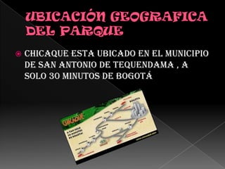 El Parque Chicaque se encuentra en el municipio de San Antonio de Tequendama, a 30 minutos de Bogotá. Cubre 244 hectáreas de bosque de niebla con más de 10 km de senderos ecológicos que atraviesan quebradas cristalinas, nacimientos de agua pura, robledales y vegetación en peligro de extinción. El parque ofrece observación de la naturaleza, contacto con el medio ambiente y diversidad de flora y fauna, con 214 especies de aves y 20 de mamíferos.
