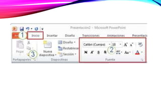Este documento proporciona información sobre PowerPoint y su uso para crear presentaciones. Explica qué es PowerPoint, sus beneficios, las funciones principales como agregar diapositivas, texto, imágenes y animaciones. También describe elementos clave como la cinta, las vistas de diapositivas y cómo copiar, mover y duplicar diapositivas.