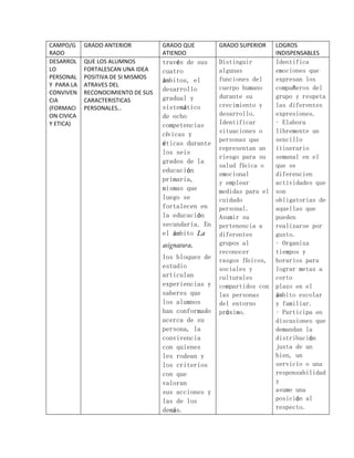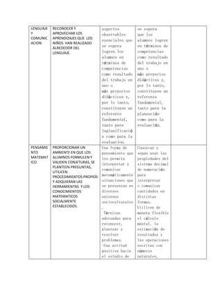 El documento presenta los logros esperados para los estudiantes en varias áreas de desarrollo personal y académico. Se espera que los estudiantes fortalezcan su autoestima, reconozcan emociones, identifiquen partes del cuerpo humano, usen el sistema decimal, reconozcan normas sociales y mejoren su salud física.