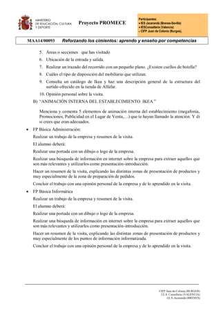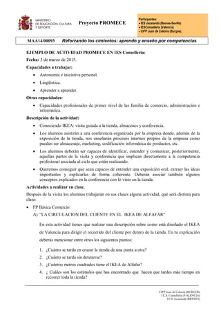 El documento describe un proyecto PROMECE que involucra a tres escuelas en España. Como parte del proyecto, los estudiantes de IES Conselleria en Valencia visitarán la tienda IKEA para una conferencia y tour guiado para desarrollar habilidades como autonomía, comunicación y aprendizaje. Después de la visita, los estudiantes completarán actividades en clase relacionadas a sus especialidades para analizar aspectos como el diseño de la tienda y los procesos internos de IKEA.