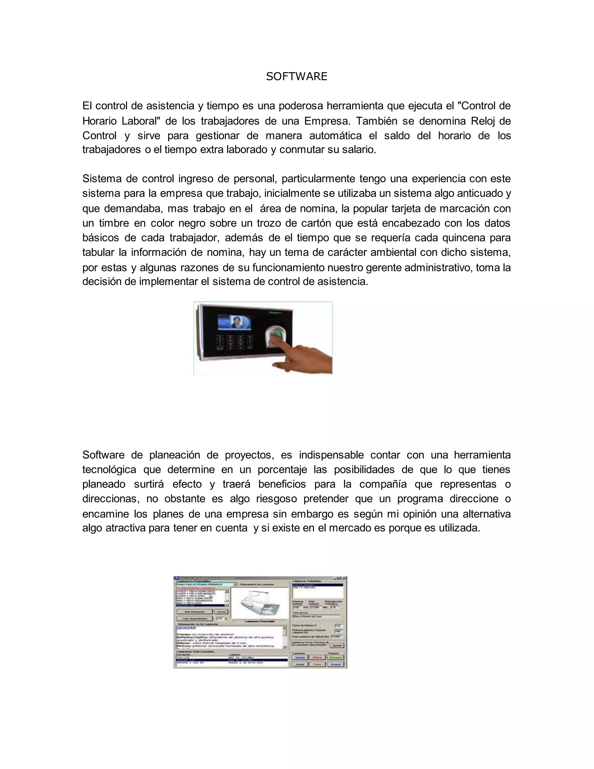 El documento trata sobre diferentes sistemas y software utilizados en empresas. Describe un sistema de control de asistencia que registra el horario de los empleados, un software de planeación de proyectos que evalúa las posibilidades de éxito, y un sistema GPS que proporciona información de ubicación y parámetros de vehículos. También menciona un sistema voice picking que optimiza inventarios mediante el reconocimiento de voz y códigos de barras.