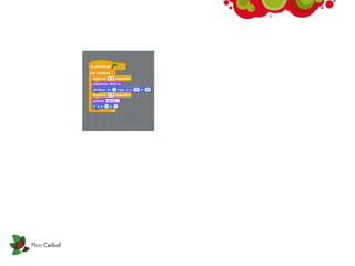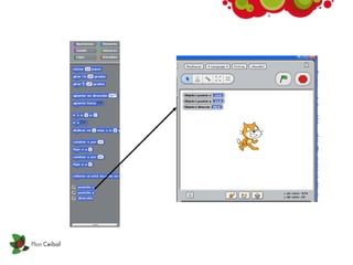 Este documento presenta las principales herramientas y funcionalidades del entorno de programación Scratch. Describe la interfaz principal con áreas para programas, bloques, escenarios, personajes y sonidos. Explica cómo mover y modificar objetos, insertar y editar disfraces, fondos y sonidos, y cómo programar el comportamiento de los objetos utilizando bloques de diferentes familias como movimiento, apariencia, control y sensores. También muestra cómo guardar y compartir proyectos Scratch.