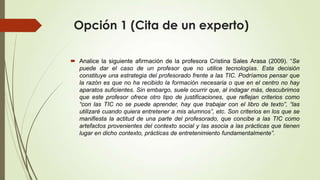La profesora Cristina Sales Arasa argumenta que algunos profesores ven las TIC solo como herramientas de entretenimiento y no para el aprendizaje. Esto se debe al miedo al cambio y a romper con los viejos paradigmas educativos. Sin embargo, las nuevas tecnologías ofrecen nuevas formas de comunicación y aprendizaje que requieren nuevas competencias de los docentes. El uso efectivo de herramientas como las redes sociales y nuevas tecnologías pueden mejorar la enseñanza y lograr objetivos educativos de man