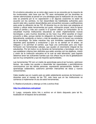 El documento presenta una actividad semanal para el uso de las tecnologías de la información y la comunicación (TIC) en la formación. Los participantes deben realizar un test de inteligencias múltiples, escoger una herramienta TIC según su estilo de aprendizaje y utilizarla para presentar una reflexión analítica sobre el uso de las TIC en la educación. El documento también discute los desafíos que enfrentan los docentes al integrar las TIC debido a la falta de capacitación y el temor al cambio, pero enfat